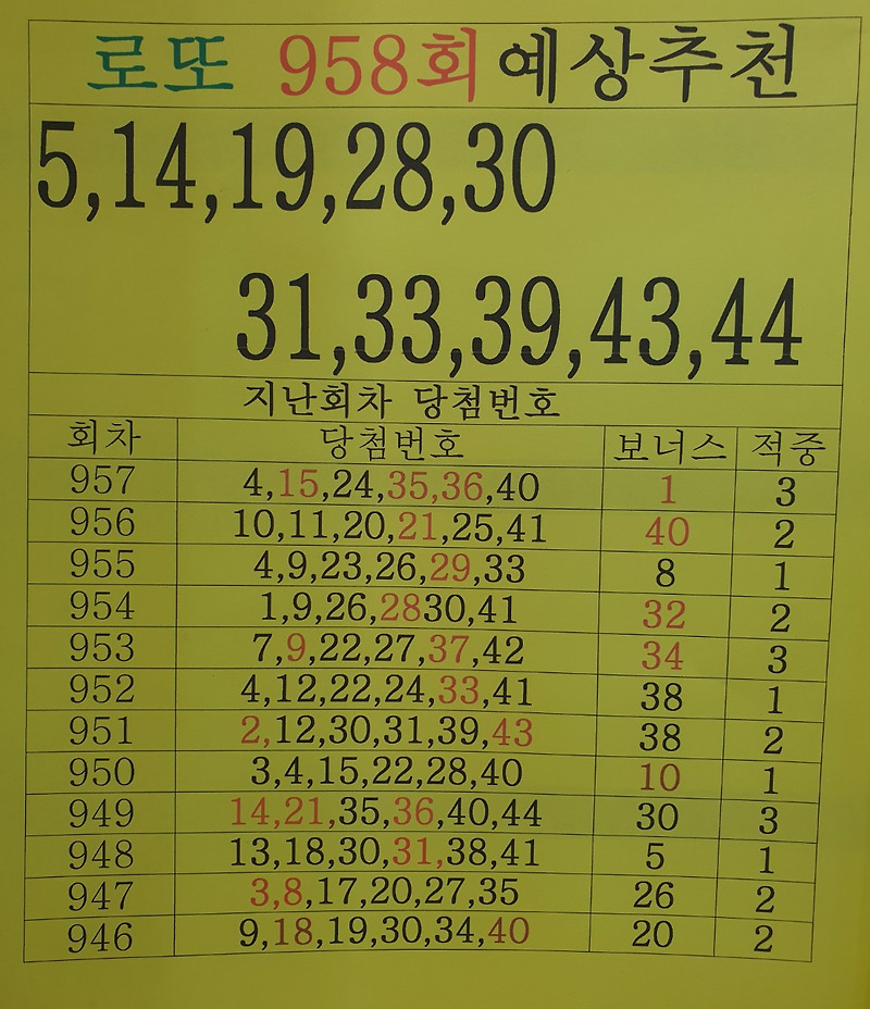 스포츠한국:로또 962회 당첨번호+1등 배출 지역·전국 명당은? from photo.hankooki.com 로또962회 당첨번호 예상 0순위는 13 21 29 25 28 34, 로또963회 당첨번호 예상 2순위 22 32 33 43 13 3, 로또962회 당첨번호 예상 4순위는 24 13 29 38 29 32, 로또962회 예상 번호 6순위는 13 21 14 34 43 23 과 21 14 18 28 44 5. 로또 당첨, 축적된 분석데이터와 인텔리전트 시스템 접목한 당첨확률, 분석 시뮬레이션을 통환 최적의. ☆ 962회 로또 당첨번호 | 로또파트너. 961회 2021.05.01 추첨보기 무료 예상번호 신청 1등. 962회 로또 당첨번호의 번호 조합은 10번대 1개, 20번대 2개, 30번대 2개, 40번대 1개로 나온다고 정해봤다. 962회 로또 당첨번호 | 스카이로또 무료웹툰 사주운세. 로또 당첨, 축적된 분석데이터와 대박예측시스템 접목한 당첨확률, 분석 시뮬레이션을 통한 최적의 확률 962회 로또 당첨번호 | 로또고고 팝업레이어 알림 962회 로또당첨번호 예측에 사용되는 최근 5주 미출현 번호 기준으로 10주, 15주 미출현 여부를 체크한 자료 입니다.